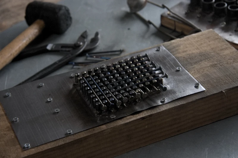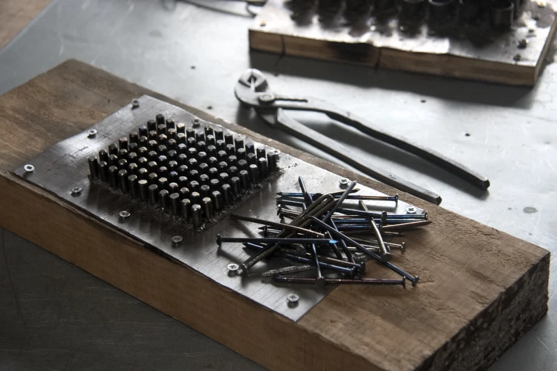 Profilés aluminium, fils métalliques, quincaillerie, verre synthétique, films miroir sans tain, briques noires.
